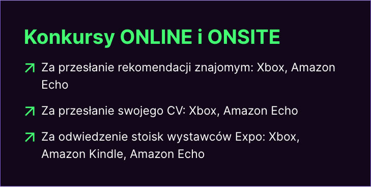 Organizatorzy przewidzieli wiele atrakcji dla uczestników od konkursów za przesłanie rekomendacji swoim znajomym, dostarczenie swojego CV lub odwiedzenie wybranych stoisk wystawców. Za udział uczestnicy mogą również uzyskać certyfikat uczestnictwa, oficjalne koszulki oraz bluzy i inne gadżety.