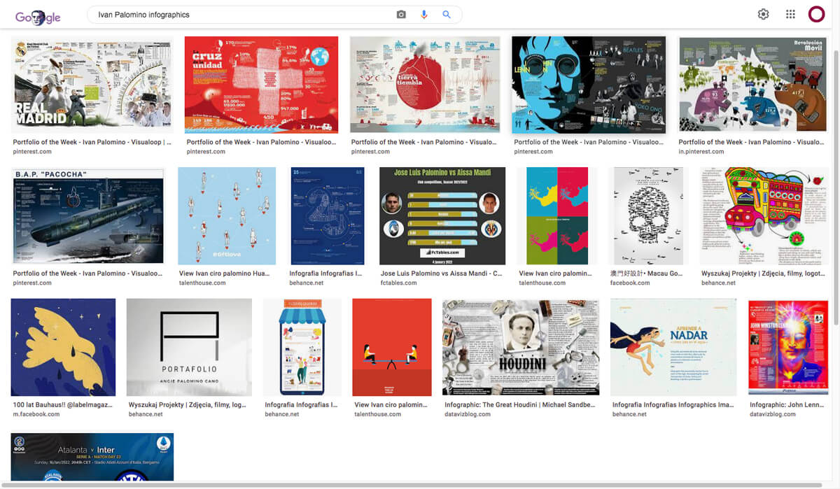 Bardzo często podczas tworzenia projektu infografiki pojawia się taka chwila, kiedy zupełnie nie wiadomo, od czego zacząć. Co zrobić, żeby projekt był prosty, przejrzysty, a zarazem ciekawy i angażujący? Wtedy też dobrą opcją może okazać się „wirtualny spacer”, mający na celu eksplorowanie świata infografiki. Aby dotrzeć do projektów infografik, których autorem jest Ivan Palomino, wpisz w okno wyszukiwarki Google frazę: „Ivan Palomino infographics”. W następnej kolejności przełącz widok na grafikę. Dzięki temu możesz zobaczyć przykłady projektów, które w Google Images pozycjonują się jako realizacje tego projektanta.